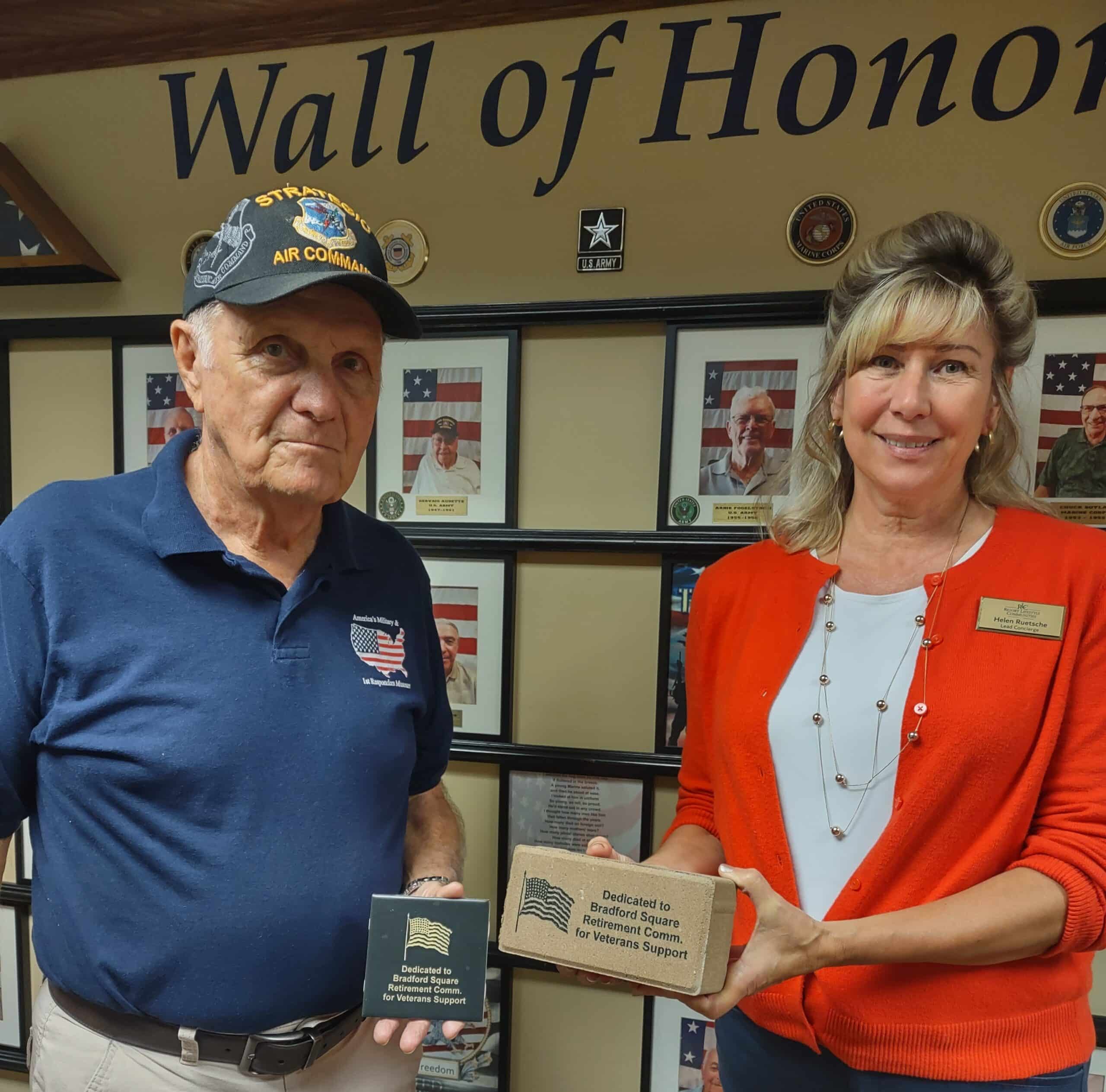 Docent, George presenting Memorial Paver to Helen, Concierge of Bradford Square.