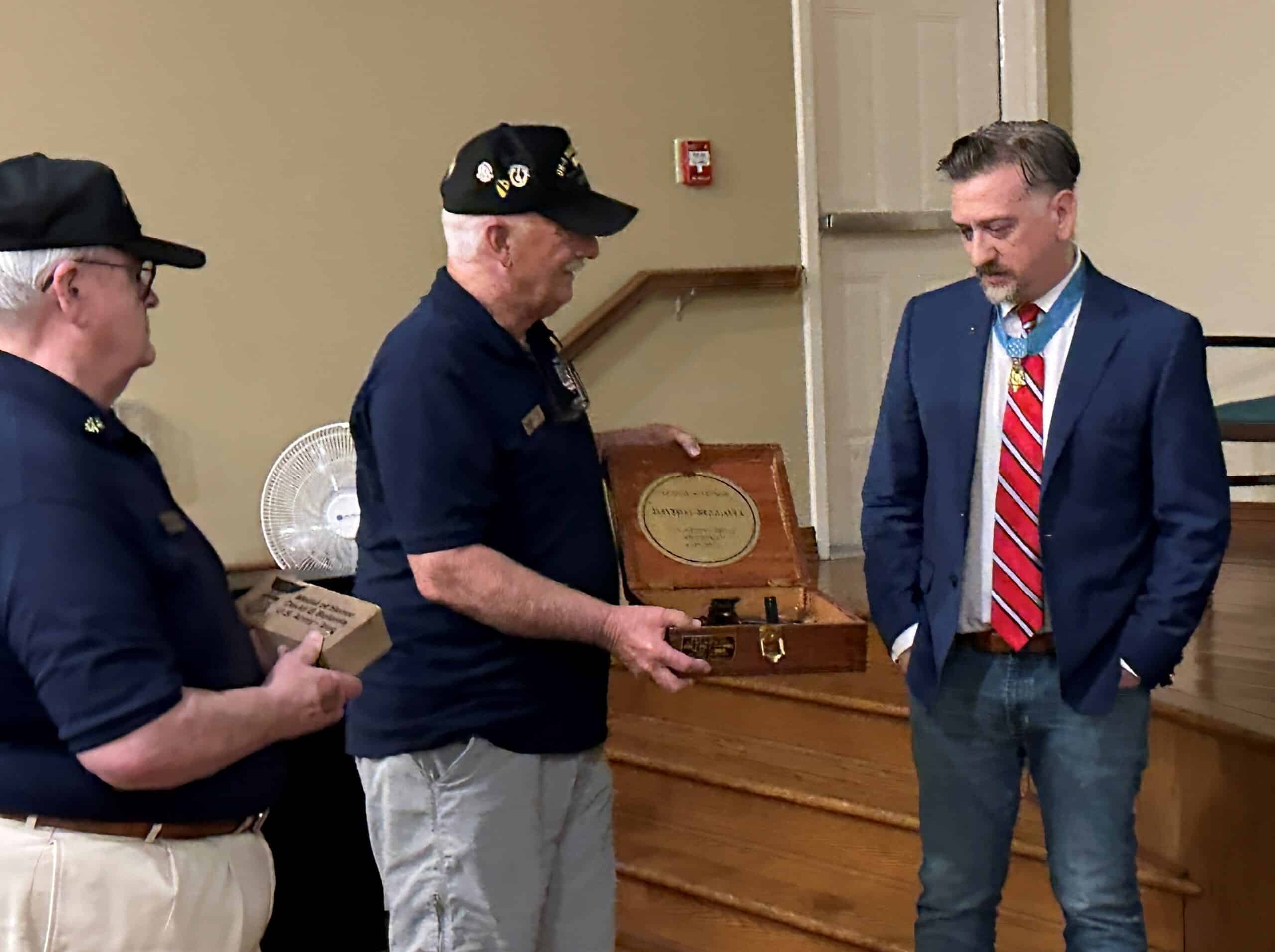 From left to right: Kent Weston presenting Paver and Tom Rinehart presenting new 1941 US Navy Bearing Circle to David Bellavia, the only surviving Medal of Honor recipient from Iraq War.