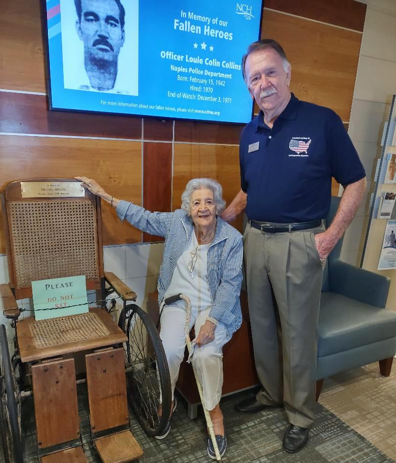 Joe McVay, museum Board of Director, presenting 1950’s all wood wheelchair to Thelma Hodges who was NCH pioneer nurse in the early 50’s.